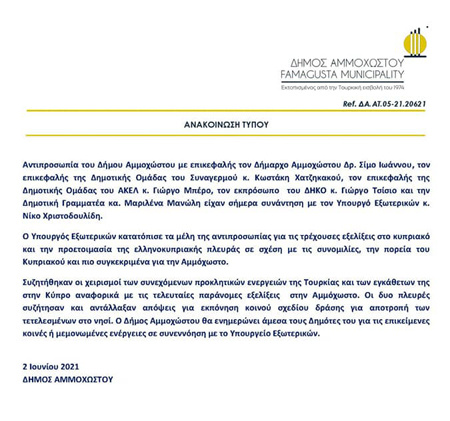 Το Δημοτικό Συμβούλιο Αμμοχώστου καταδίκασε τις απαράδεκτες ενέργειες Τούρκων και Τουρκοκύπριων πολιτικών για την Αμμόχωστο, σε ψήφισμα που επιδόθηκε σε εκπρόσωπο των Ηνωμένων Εθνών.
