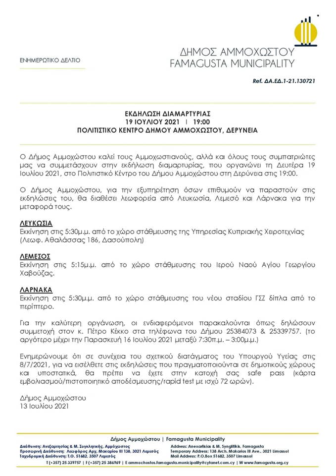 Συστρατευόμαστε με τον Δήμο Αμμοχώστου και τους Αμμοχωστιανούς και κάθε εκτοπισμένο και καλούμε όπως παρευρεθούν μαζικά στην εκδήλωση διαμαρτυρίας που οργανώνει ο Δήμος τη Δευτέρα, 19 Ιουλίου 2021, ώρα 19.00 στο πολιτιστικό Κέντρο Δήμου Αμμοχώστου, Δερύνεια.