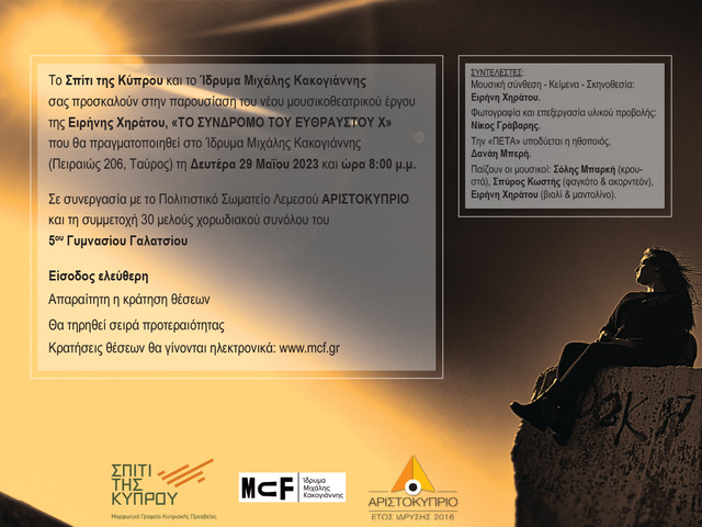 σας προσκαλούνστην παρουσίαση νέου μουσικοθεατρικού έργου της Ειρήνης Χηράτου, «ΤΟ ΣΥΝΔΡΟΜΟ ΤΟΥ ΕΥΘΡΑΥΣΤΟΥ Χ»…που θα πραγματοποιηθεί τη Δευτέρα 29 Μαϊου 2023