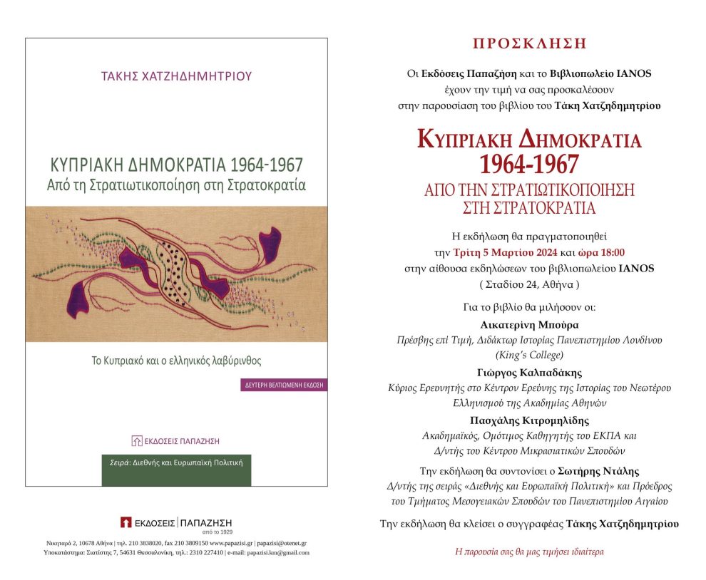 Την Τρίτη 5 Μαρτίου στον ΙΑΝΟ, στην οδό Σταδίου στην Αθήνα οι Εκδόσεις Παπαζήση οργανώνουν παρουσίαση του βιβλίου του “Κυπριακή Δημοκρατία 1963-1967 Από τη Στρατιωτικοποίηση στη Στρατοκρατία”. Στη παρουσίαση θαμετάσχουν ο Ακαδημαϊκός και καθηγητής Πασχάλης Κιτρομηλίδης, η Κατερίνα Μπούρα Πρέσβης επί τιμή και ο Ερευνητής της Ακαδημίας Αθηνών Γιώργος Καλπαδάκης.